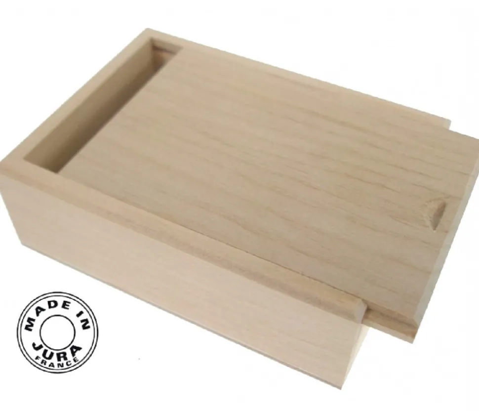 Une petite boite en bois naturel fabriquée dans le Jura. Belle qualité. Couvercle qui se glisse pour refermer le coffret.