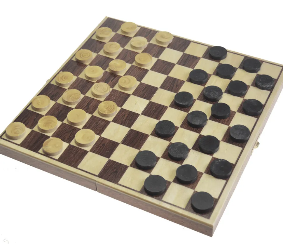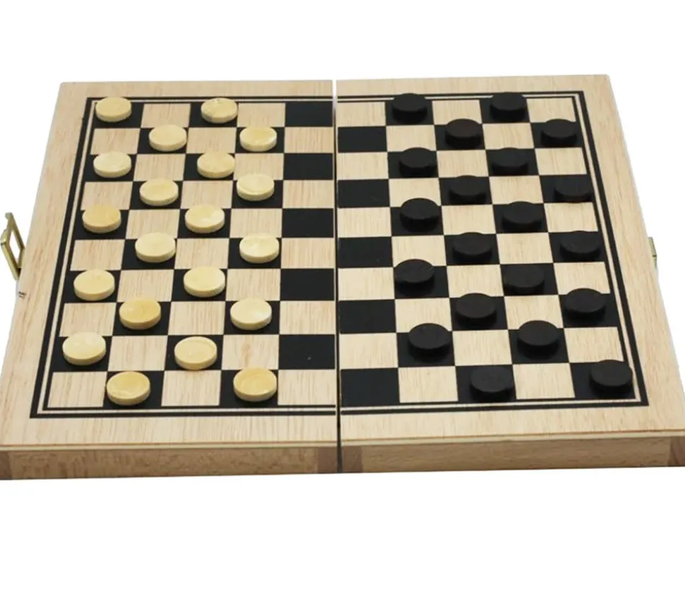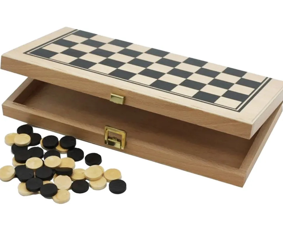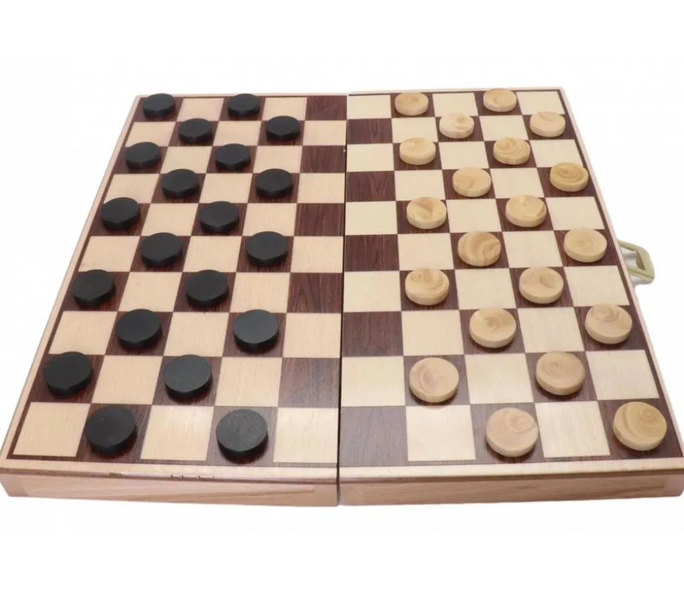 Coffret de Jeu de Dames en bois pliable en deux. Jeu très pratique avec tous les pions qui se rangent dans le coffret. Coffret fermé : 30 x 15 x 4 cm.