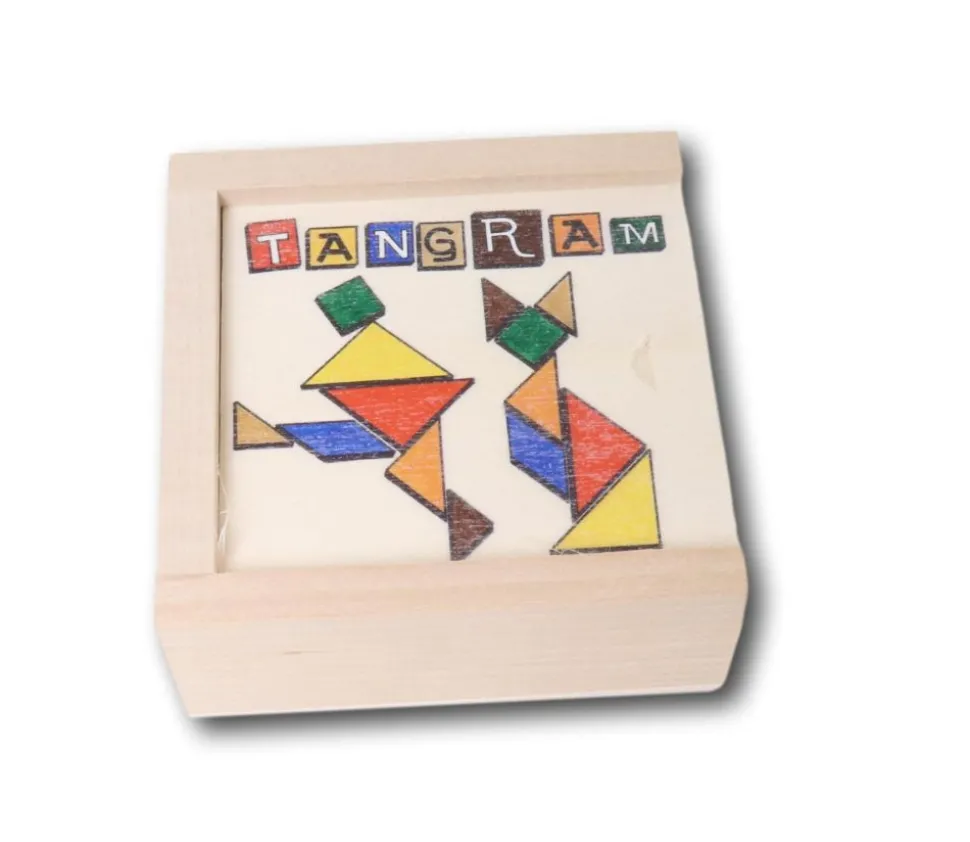Tangram en bois coloré dans un coffret. Jeu d’esprit traditionnel.
