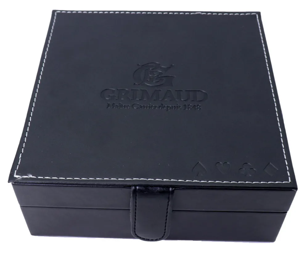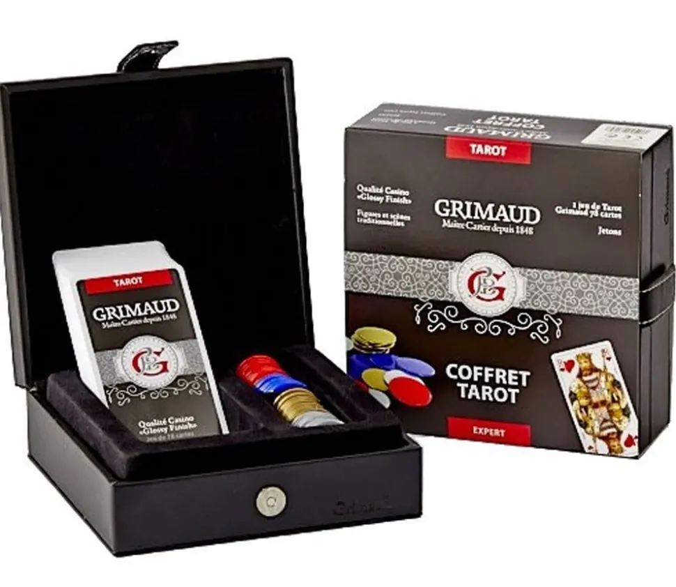 Beau coffret Tarot façon cuir complet pour les passionnés de jeu de Tarot avec jeu de carte Grimaud expert, qualité « casino » et jetons colorés pour marquage des points.