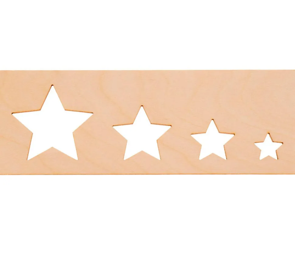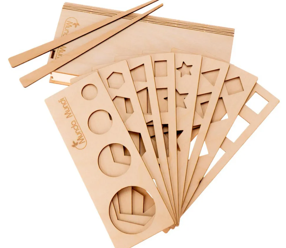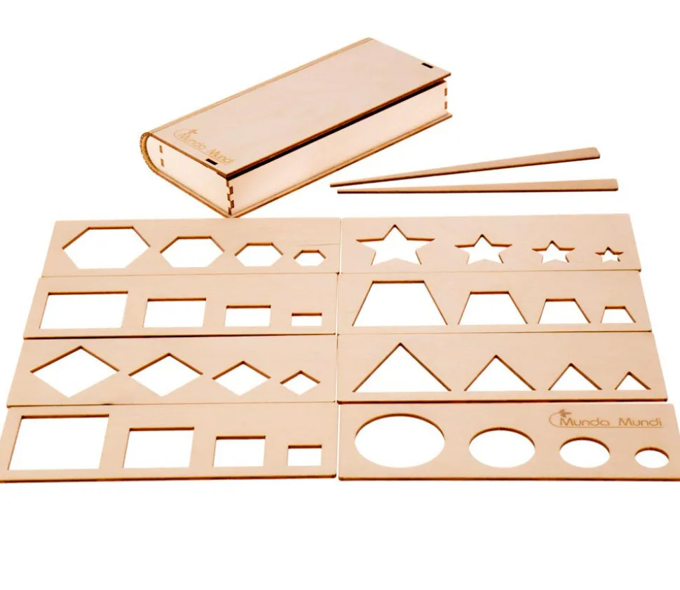Coffret de traceurs en bois pour découvrir les formes géométriques et la notion de taille : du plus grand au plus petit.