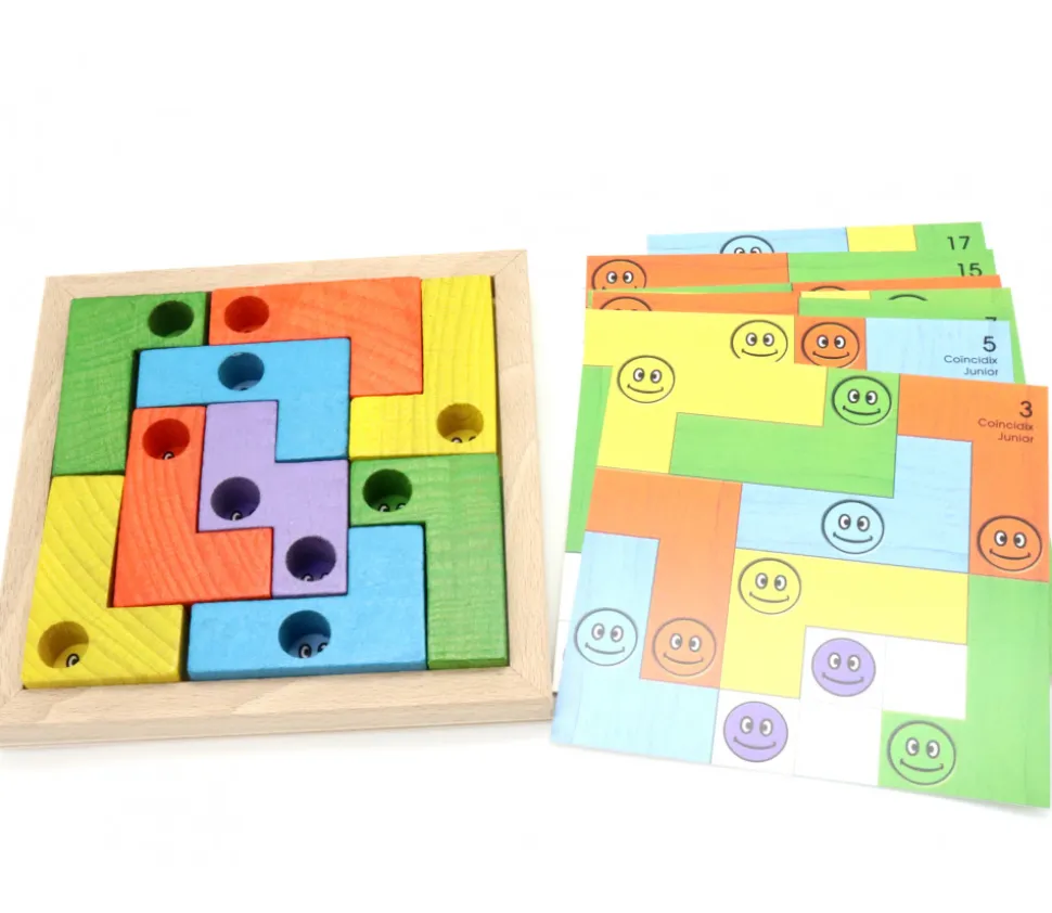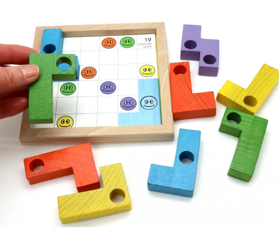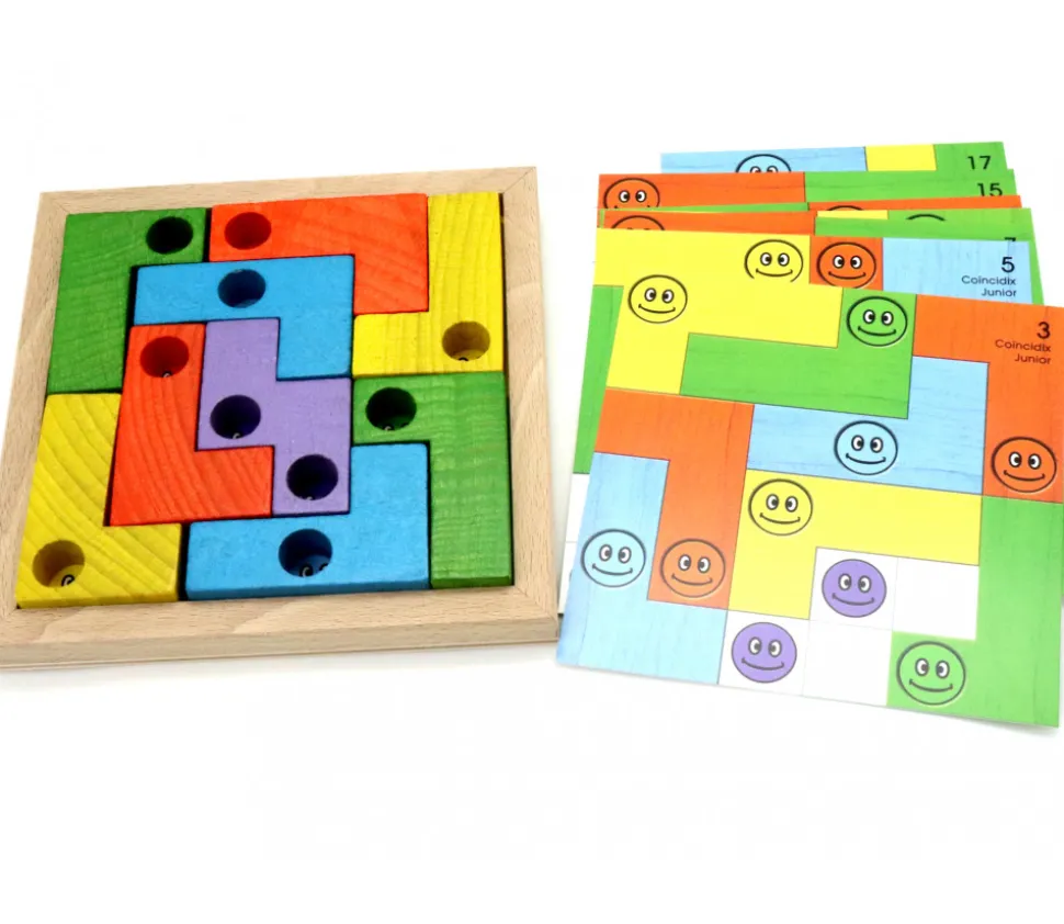 Jeu de logique Coincidix junior. Version pour les enfants, un jeu d’esprit évolutif où vous devrez positionner les pièces de manière à laisser apparaître les têtes colorées. 38 défis progressifs à réaliser. Dimensions cadre de jeu : 15 x 15 x 2 cm. Fabricant Jeandel dans le Jura en France. Difficulté progressive. Un bel objet que l’on peut laisser en décoration. Très beau cadeau.