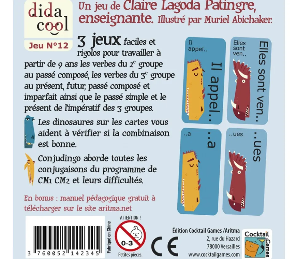 Conjudingo CM1/CM2 : 3 jeux de conjugaison : rami, mistigri et bataille. Des cartes colorées et attractives pour jouer à conjuguer. Pratiquer les différentes conjugaisons : présent, futur, passé composé, passé simple, impératif, imparfait. Jeu rigolo qui favorise l’apprentissage et la mémorisation. Jeu 2 à 6 joueurs. Durée environ 15 min. Facile d’apprendre les conjugaisons avec cet outil coloré.