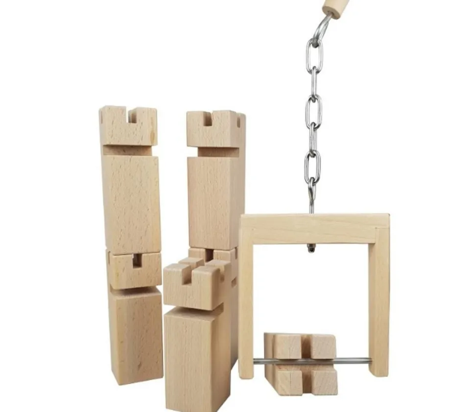 Jeu coopératif de construction pour 2 à 16 joueurs. Jeu coopératif de coordination pour animation, formation, travail d’équipe, communication. Placer un bloc en bois au centre de la pièce t et placez autant de poignées que de joueurs. Les joueurs doivent se mettent d’accord et déplacer ensemble le crochet pour attraper la pièce, vous pouvez ensuite avoir différentes consignes (le reposer sans le faire tomber, le poser sur une chaise, le mettre dans un bac…) L’objectif est d’être bien coordonné.