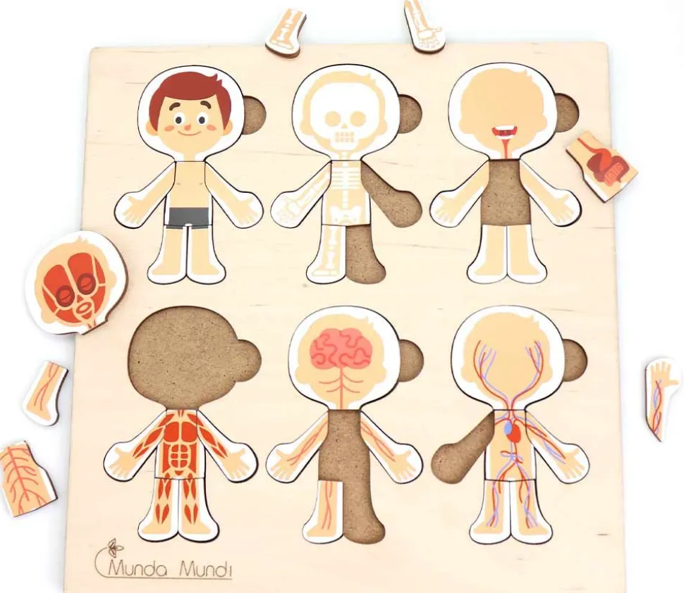 Puzzle éducatif en bois sur le corps humain. Mini puzzles avec un personnage à découvrir à travers différents aspects : les membres, les muscles, les os (squelette) le système sanguin, la digestion, les connexions nerveuses. Jeu de découverte de l’anatomie, que se passe-t-il à l’intérieur de notre corps ?