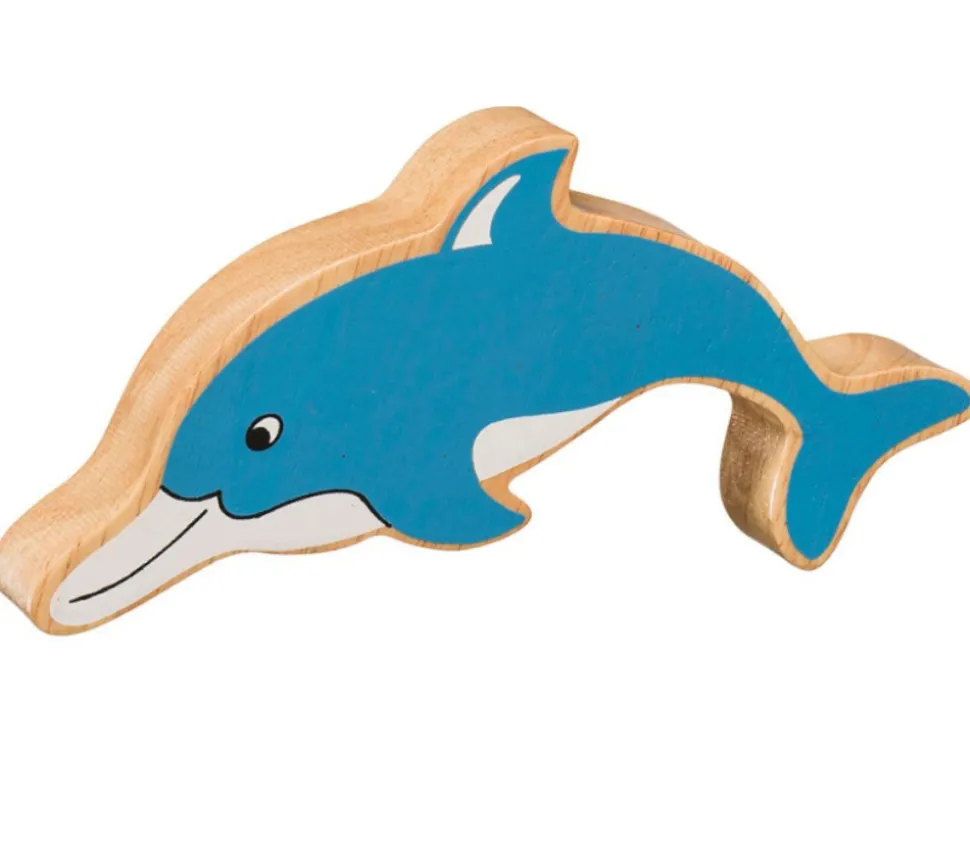 Dauphin en bois. Pion de jeu en bois très réaliste peint recto et verso. Petit dauphin bleu en bois sympathique de 141 x 60 x 24mm. Animal marin pour jouer. Pion de jeux de société ou jouet pour créer un mini monde marin. Petit dauphin à combiner avec d »autres animaux pour création de mini monde aquatique en bois avec ses jouets issus du commerce équitable.