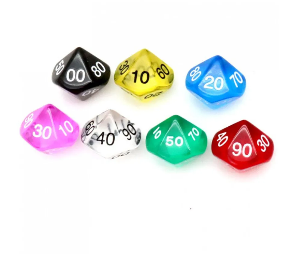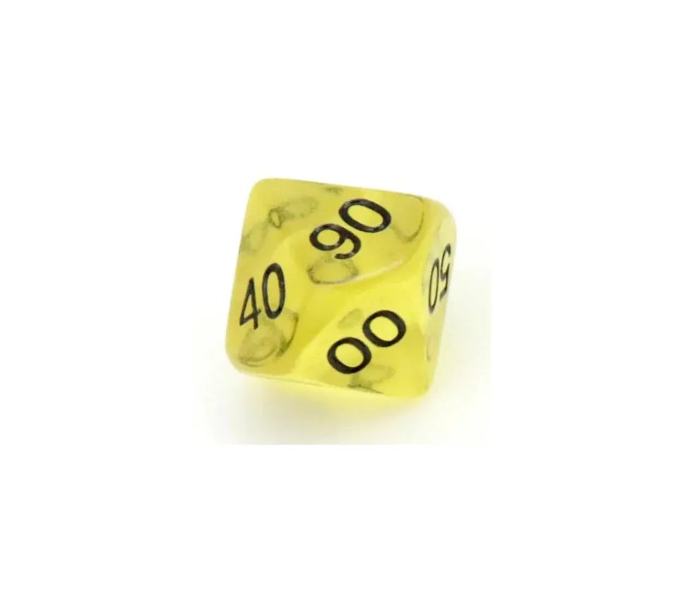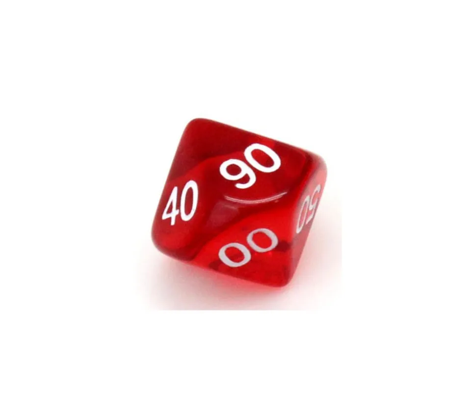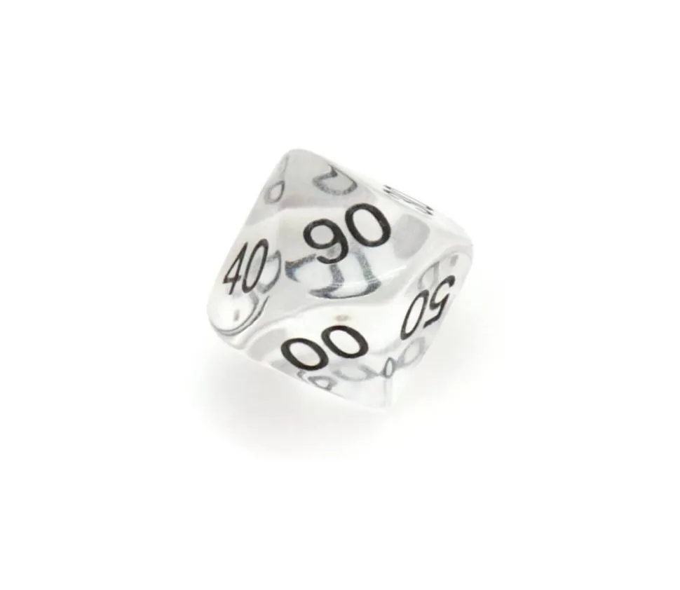 Dé à 10 faces avec les chiffres de 00 à 90. Dé en acrylique transparent coloré. Dé 10 faces dizaine très utilisé pour les jeux de rôles ou de figurines. D10 avec les faces 00 10 20 30 40 50 60 70 80 90.