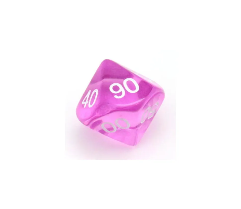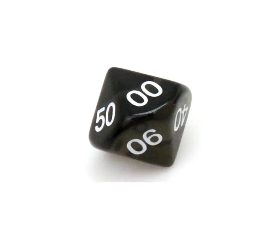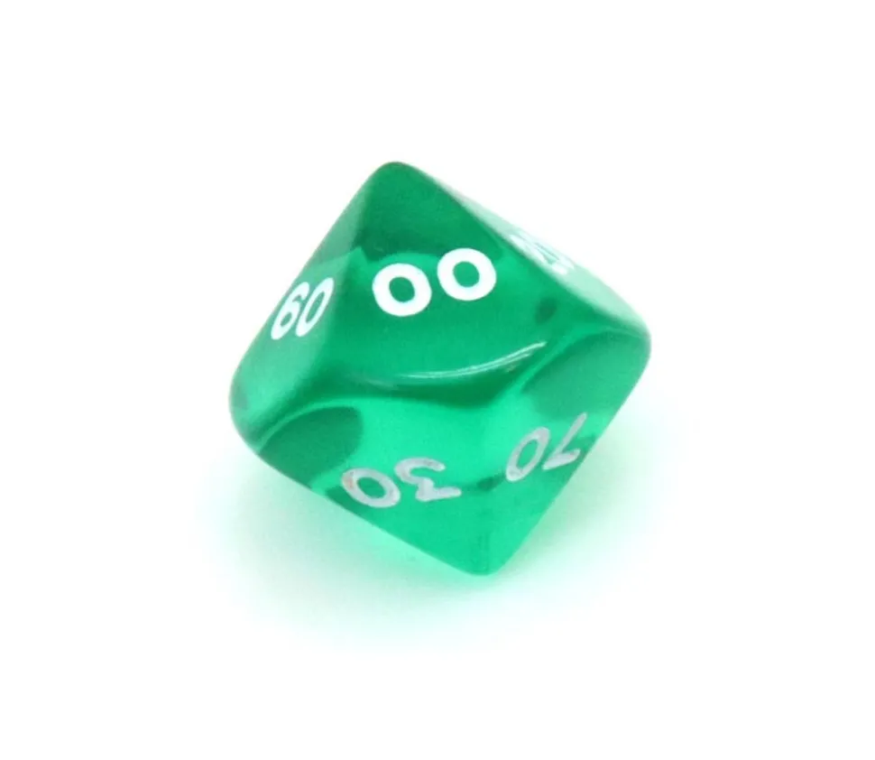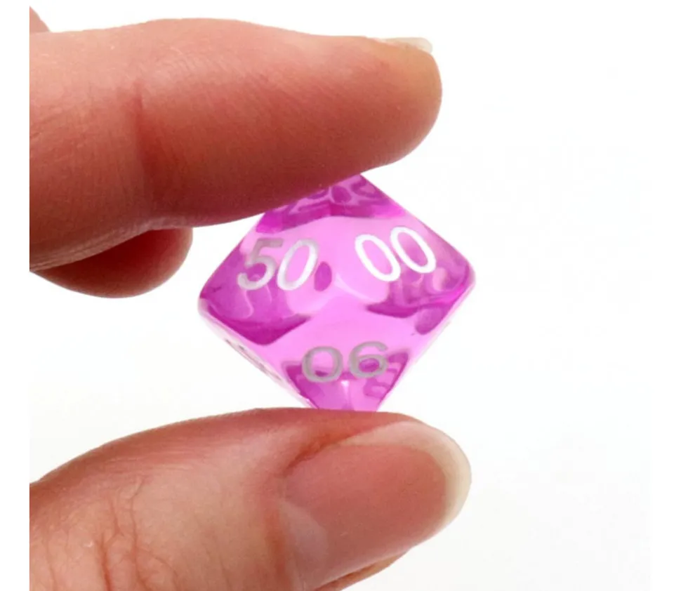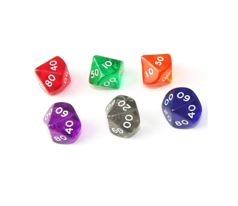 Dé à 10 faces avec les chiffres de 00 à 90. Dé en acrylique transparent coloré. Dé 10 faces dizaine très utilisé pour les jeux de rôles ou de figurines. D10 avec les faces 00 10 20 30 40 50 60 70 80 90.
