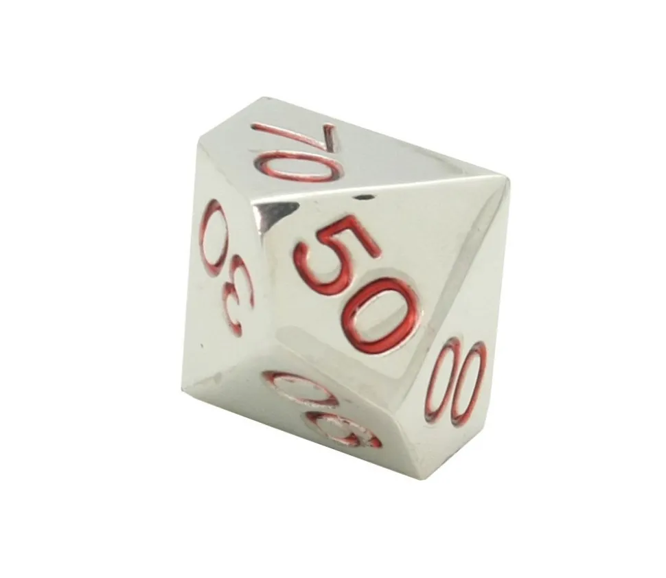 Dé à jouer en métal lourd de 10 faces avec les dizaines gravées en rouge de 00 à 90. Super agréable, le métal donne du poids à vos lancer de dés. Dé métal argent de 20 mm avec 10 faces : chiffres de 00 à 90. Un très beau dé métallique avec des chiffres en creux de couleur rouge. Dé en vrai métal.