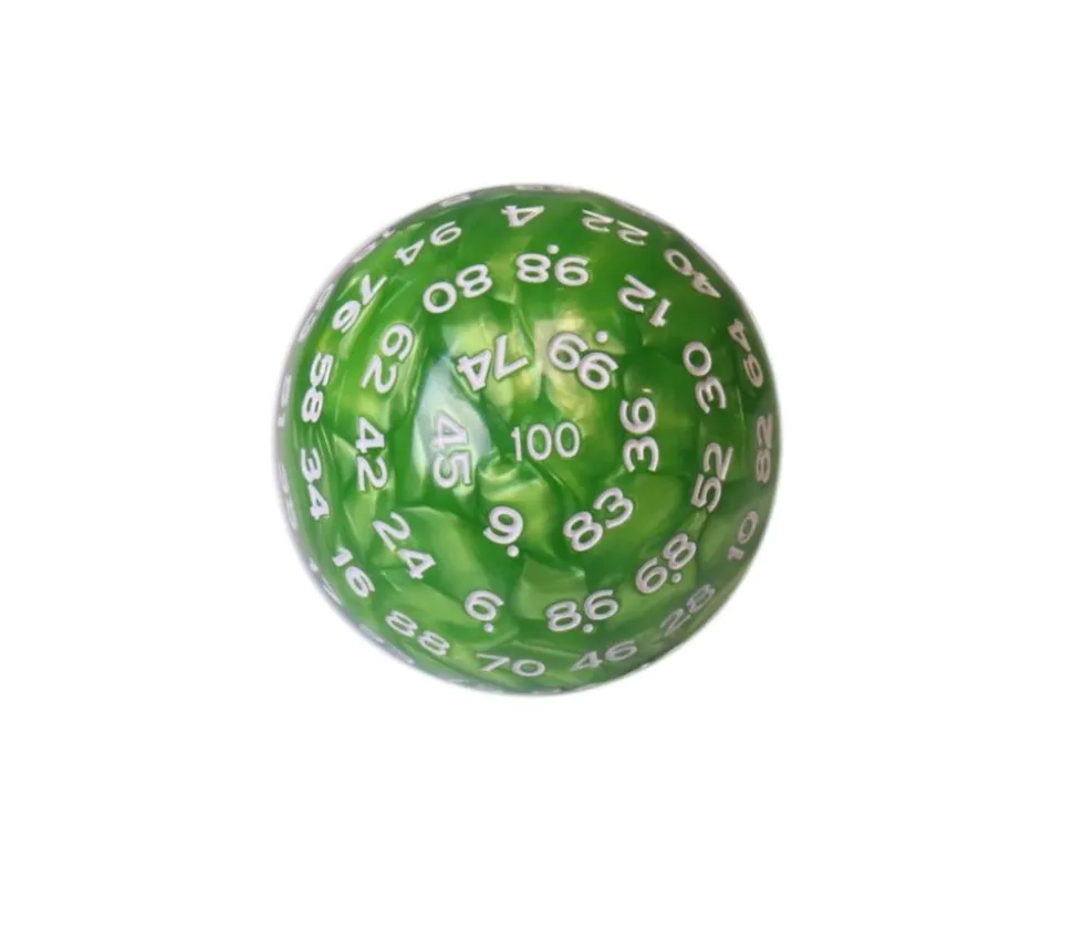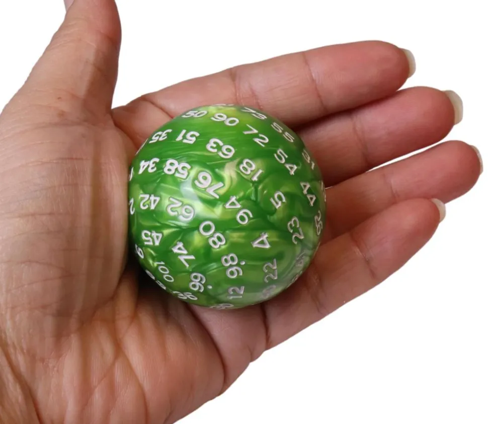 Un Dé à jouer multifaces avec 100 côtés de 1 à 100.