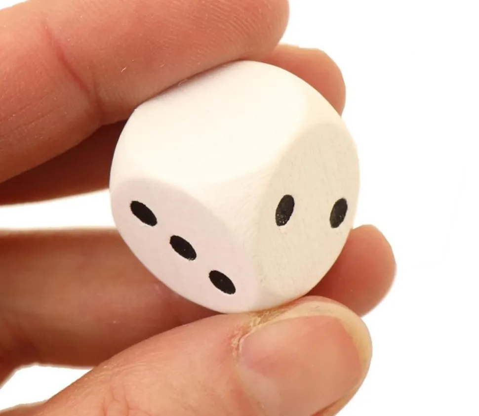 Dé blanc en bois de 2 cm à personnaliser avec un , des ou des ou à utiliser telle quelle avec une face que vous pouvez utiliser comme joker.