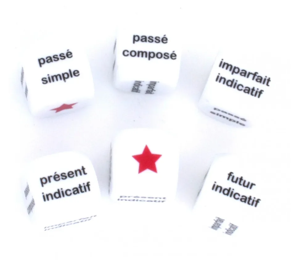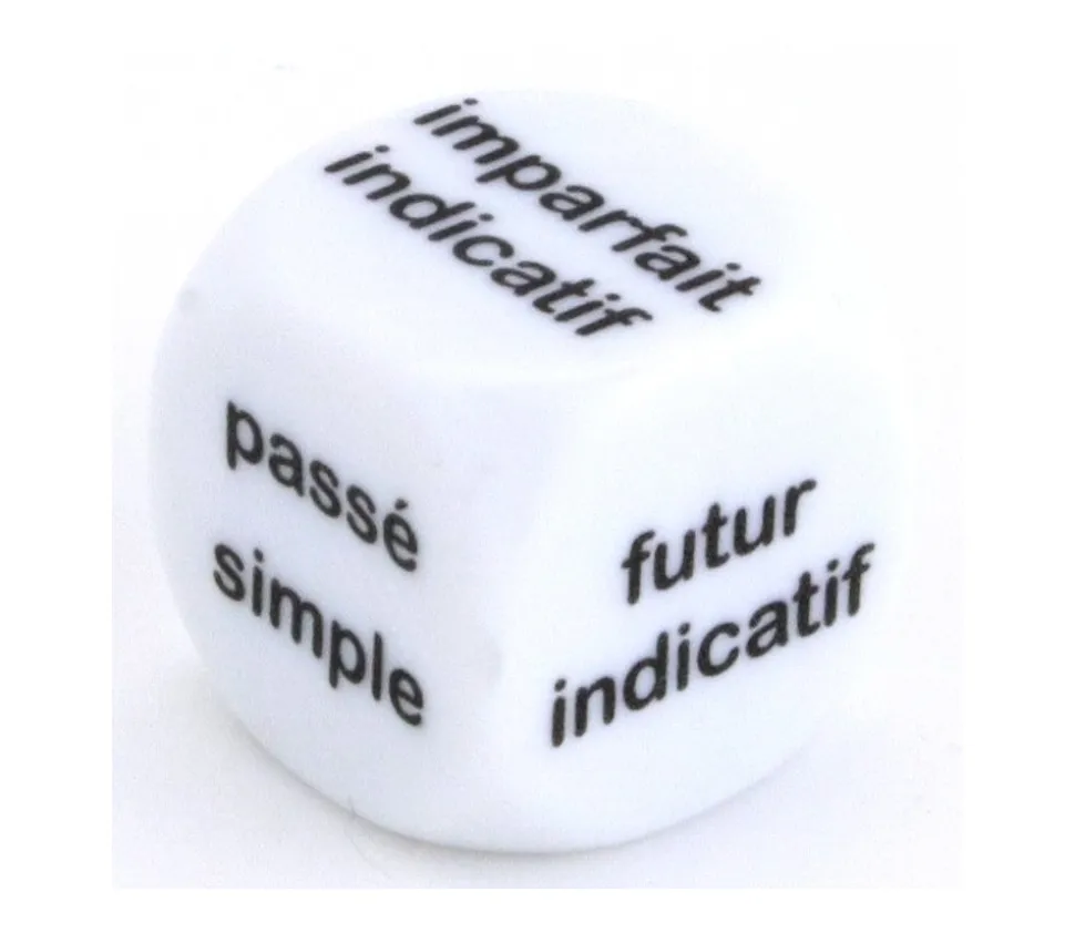 Dé à jouer français avec sur les faces les temps des conjugaisons : présent indicatif, passé simple, futur indicatif, imparfait indicatif, passé composé et 1 face joker (le joueur choisi). Dé avec sur chaque face un temps pour indiquer comment conjuguer le verbe.