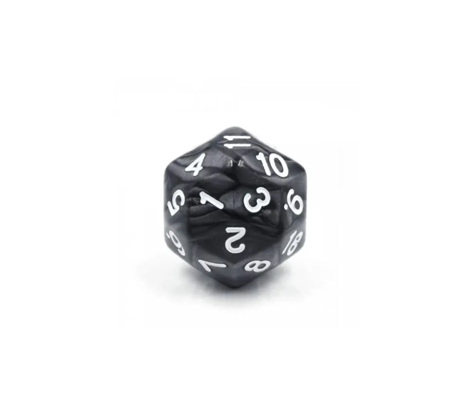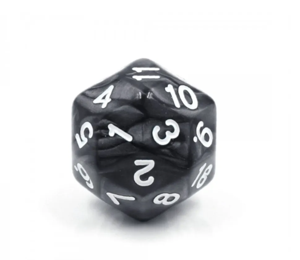 Dé noir perle avec 30 faces et des chiffres blancs.