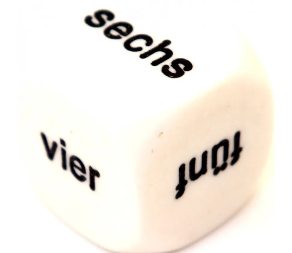 Dé allemand avec les mots des chiffres gravés sur les 6 côtés du dé : eins, zwei, drei, vier, funf, sechs