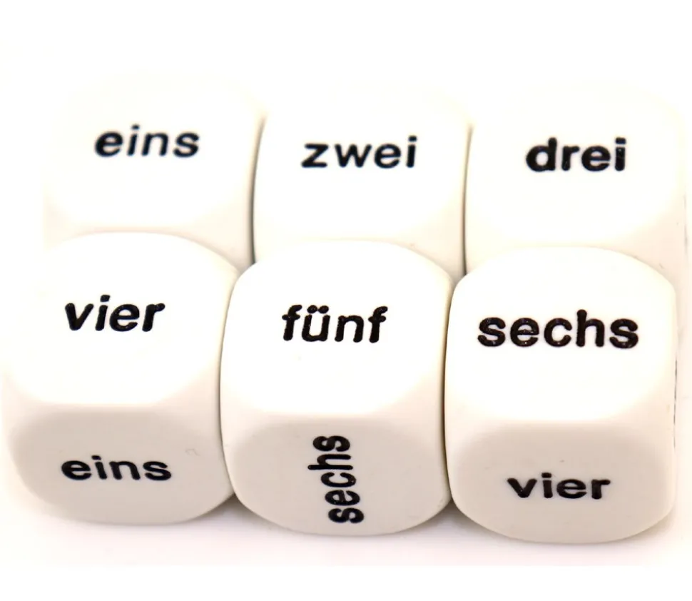 Dé spécial nombres en allemand. Dé à jouer pour formation et jeux en allemand. Accessoires de jeux pour apprentissage originaux. Adaptez vos jeux de société pour des règles spéciales. Peut-être utilisé pour accélérer les jeux de parcours comme le jeu de l’oie ou le jeu des petits chevaux en allemand