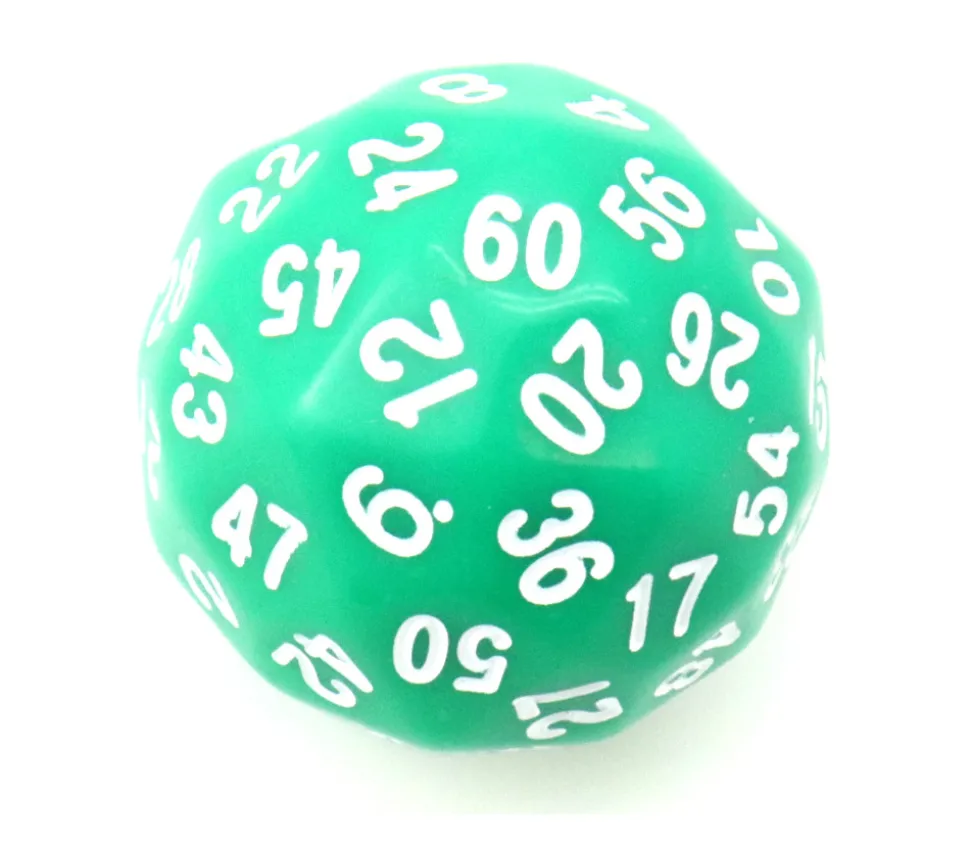 Dé 60 faces vert. Dé à jouer multifaces avec 60 côtés de 1 à 60, idéal pour les jeux de rôles et certains jeux. Grand dé D60 opaque de 35 mm de diamètre avec nombres de 1 à 60. Vendu à l’unité.