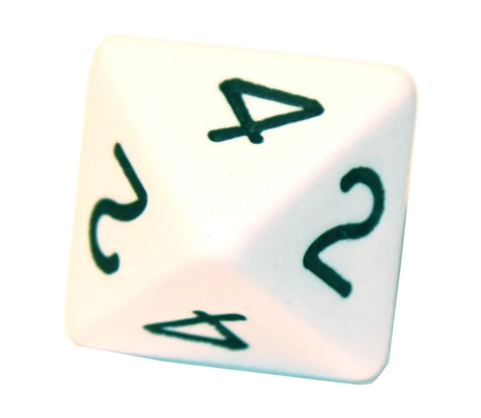Dé de 1 à 4. Dé avec 8 faces : 1,2,3,4,1,2,3 et 4. Dé de 23 mm de diamètre en plastique blanc. Dé à jouer spécial idéal pour certains jeux.