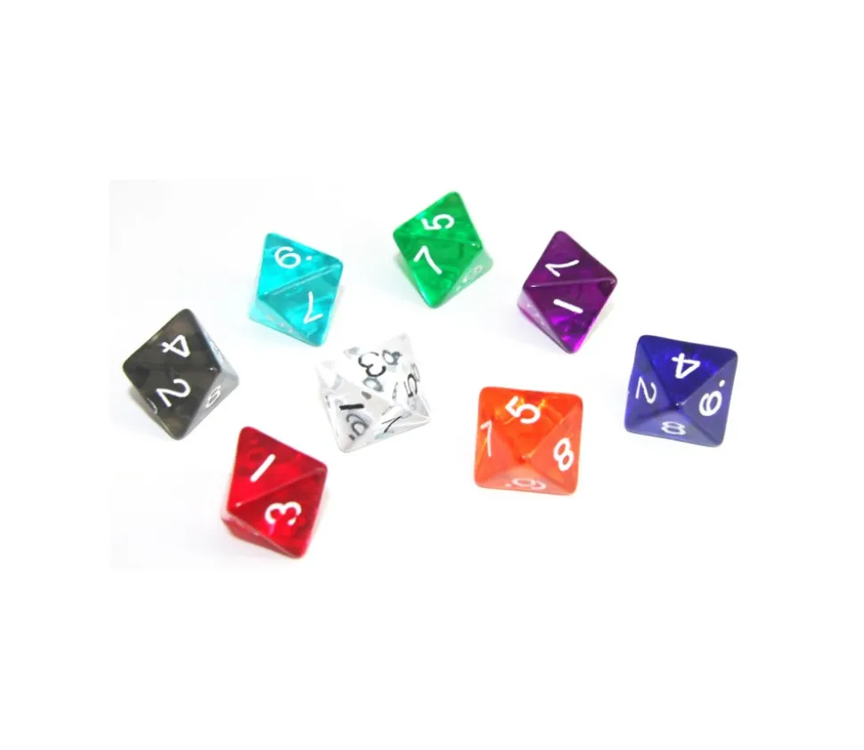 Dé à 8 faces avec les chiffres de 1 à 8. Dé en acrylique transparent coloré. Dé très utilisé pour les jeux de rôles ou de figurines. Peut-être utilisé pour jouer plus vite à certains jeux de société. D8 en plastique couleur transparente en vente à l’unité.