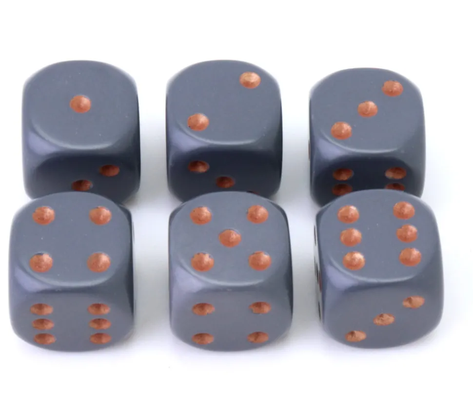 Dé à jouer 16 mm D6 opaque gris foncé. Très beau dé avec points cuivrés de 1 à 6 qui font un bel effet.