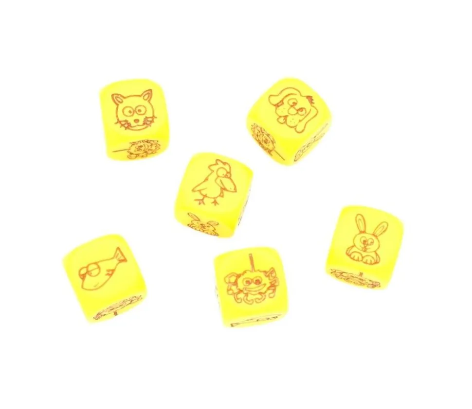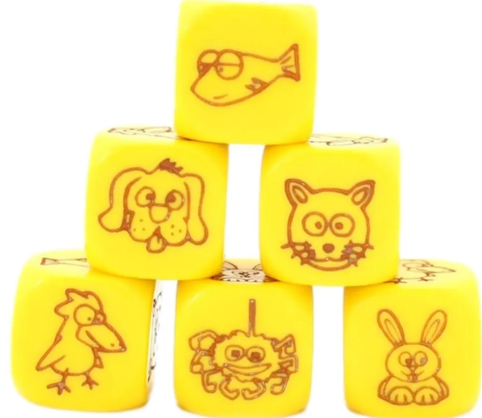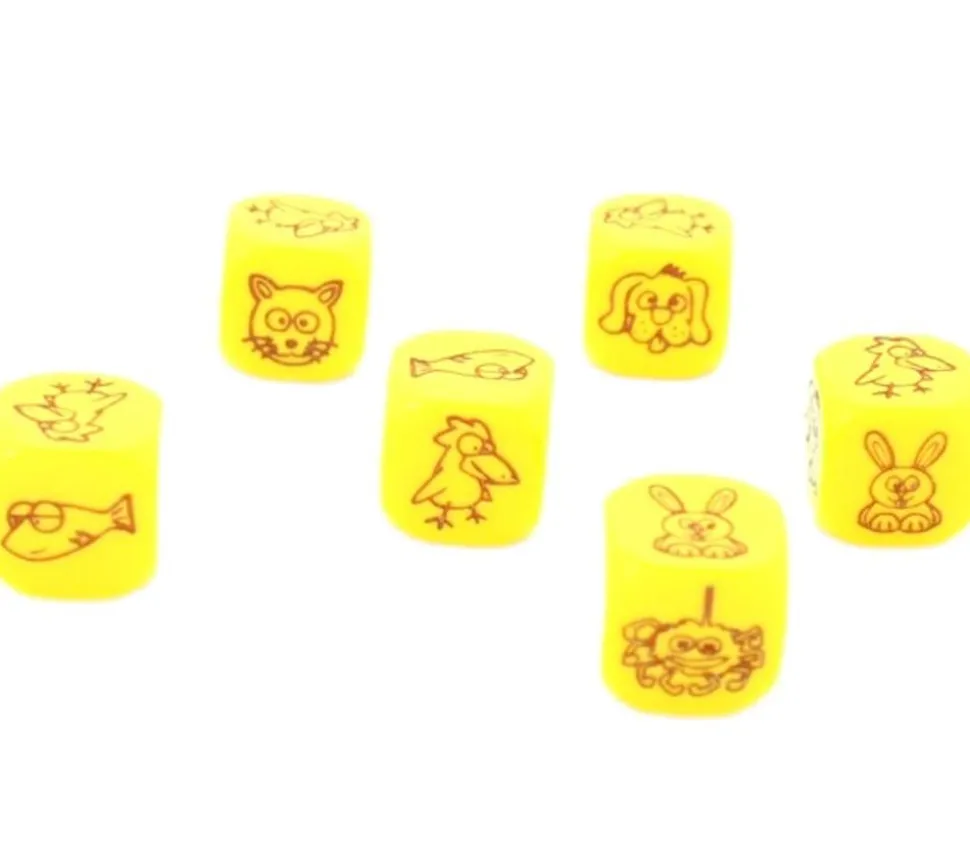 Dé avec des faces spéciales : animaux rigolos. Dé à jouer jaunes avec les faces gravée suivantes : chat, lapin, chien, crabe, oiseau, poisson. Dé gravé de 1.8 cm avec les coins arrondis. Prenez plusieurs dés de jeux et créer votre jeux de yams animaux pour jouer avec les plus petits. Tête d’animal gravé rigolo à mimer ou pour faire une actions spéciale associée. Vente à l’unité.