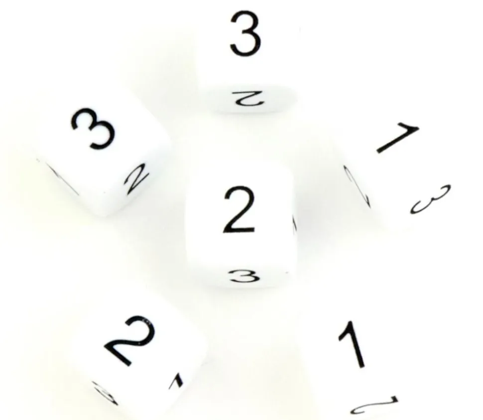 Dé à jouer de 1 à 3 avec les chiffres. Dé blanc en plastique et coins arrondis. Dé de 16 mm de côté.