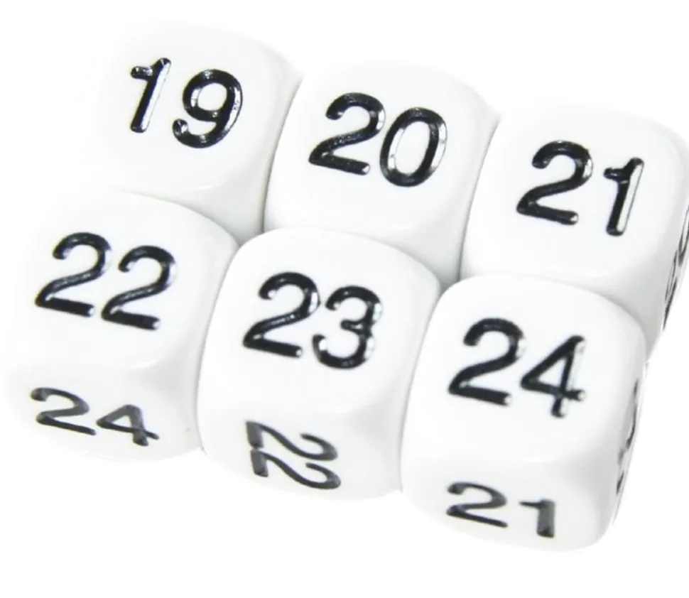 Dé à jouer de 19 à 24 avec les chiffres à la place des points. Dé 6 faces spécial de 16 mm de côté avec des grands nombres. Accélarateur de jeux ou support pour des exercices de mathématiques ludiques. Dé chiffres 19-24.