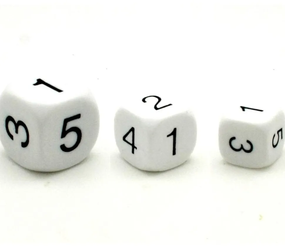 Dé à jouer de 1 à 6 avec les chiffres à la place des points. Dé blanc en plastique et coins arrondis. Dés de 16 mm de côté. Vendu à l’unité ou par lot.