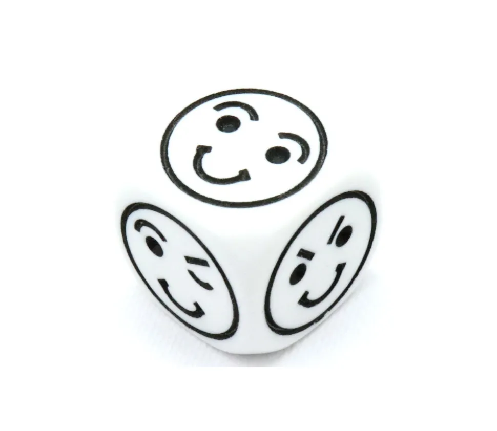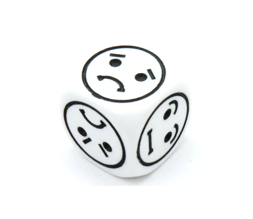 Dé en plastique blanc avec des visages sur les 6 faces du dé. Sur chaque face du dé, vous retrouverez une émotion de visage différente gravé en noir.
