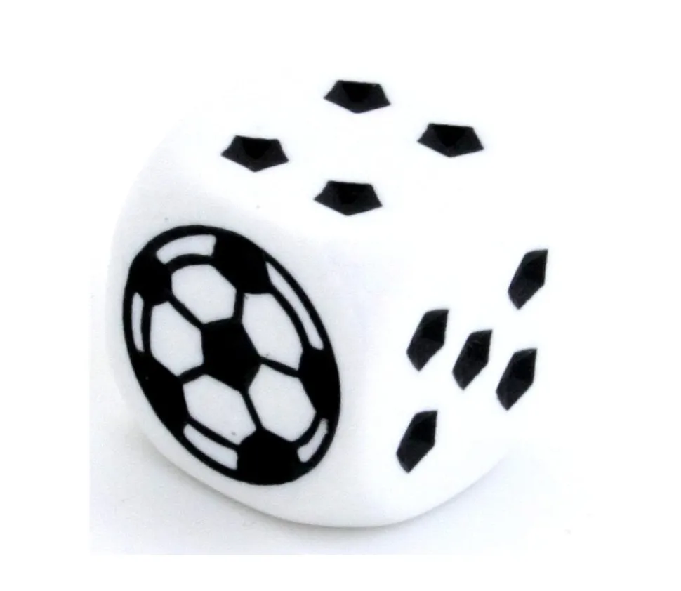 Dé à jouer avec des ballons de foot. Dé blanc sur le thème du foot avec les points remplacer par des petits pentagones et la face 1 par un ballon de football, Vous pouvez les utiliser dans vos jeux de société pour remplacer des dés classiques. Dé 6 faces avec coins arrondis de 18 mm. Accessoire de jeux pour les fans de football et de jeux de société. Dé gravé pour une meilleure durée.