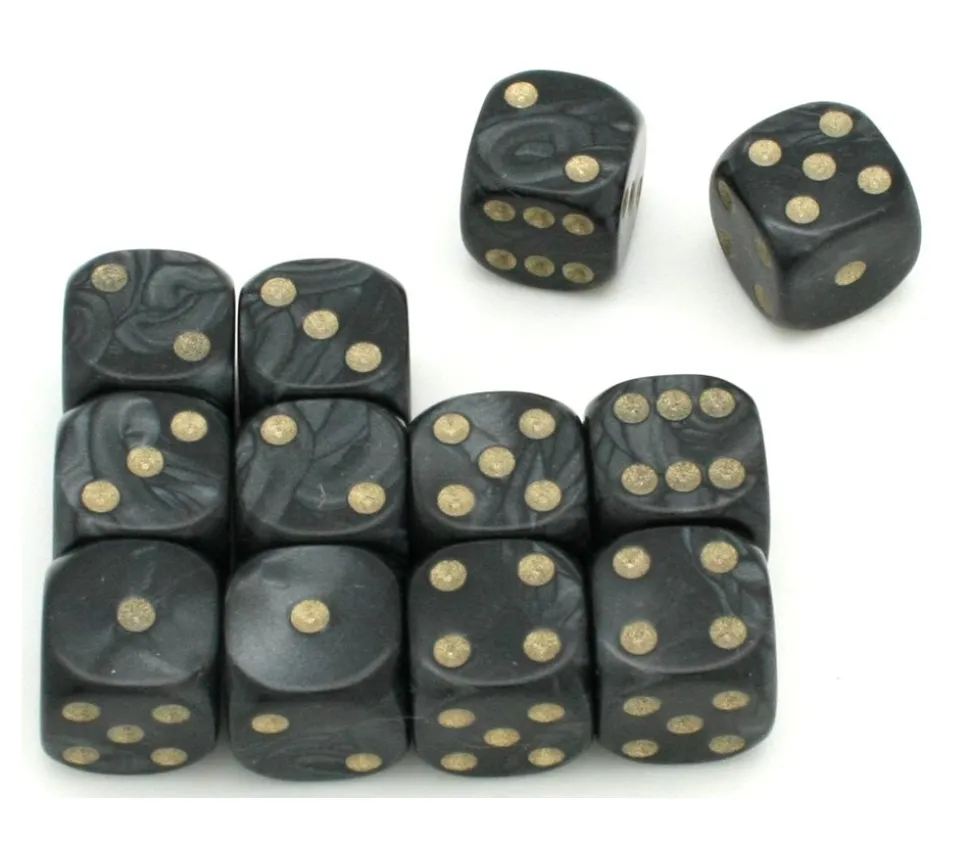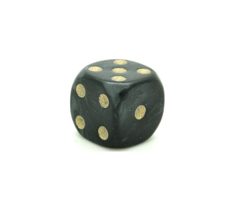 Dé à jouer nacré noir de 16 mm avec coins arrondis et marquage doré sur les faces du dé. Dé de jeu de taille standard de 1.6 cm avec marquage habituel. Un joli dé aux couleurs nacrées avec des reflets à l’intérieur du cube. Accessoires pour jeu de rôle, jeu de société ou de stratégie. Vente à l’unité.