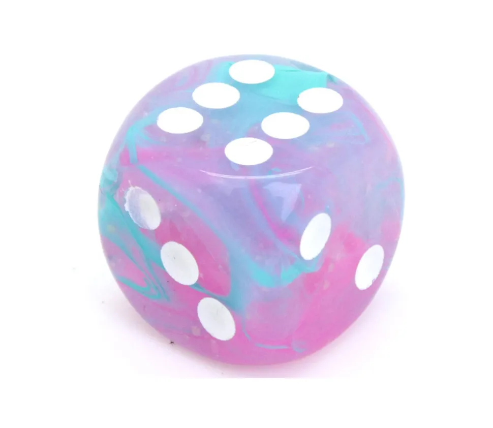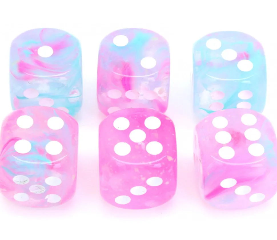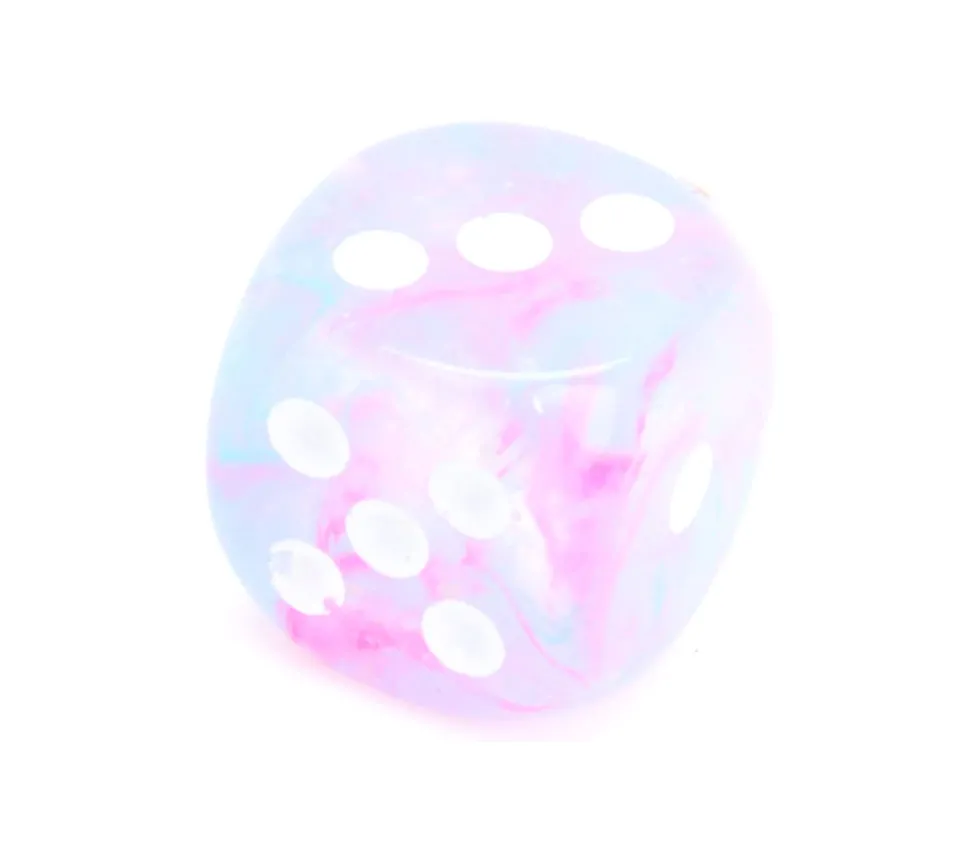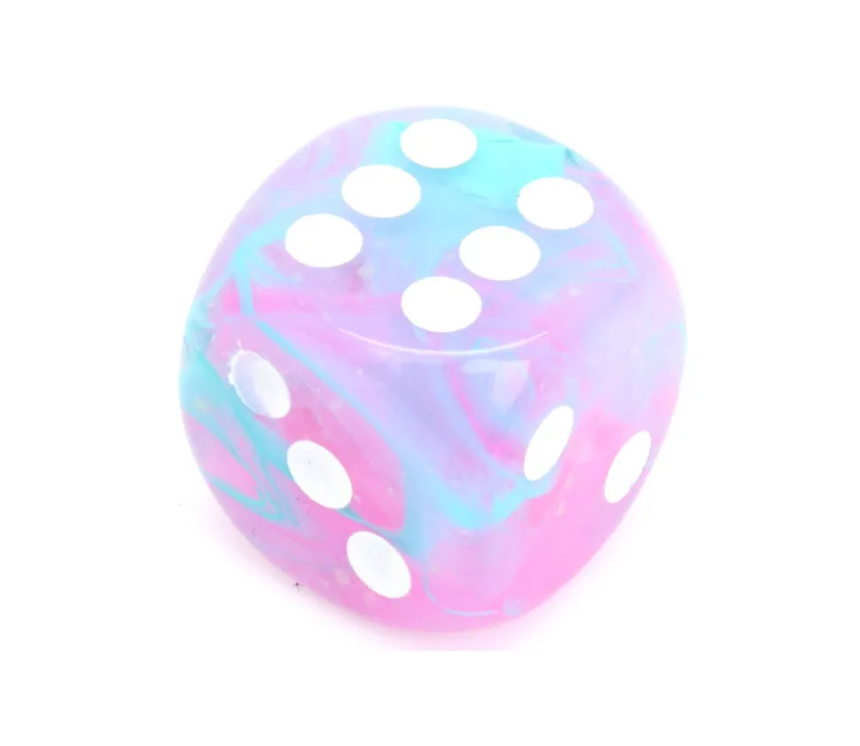 Dé à jouer de qualité chessex. Le mélange de peinture varie d’un dé à l’autre et le rend unique. Chaque dé possède des marbrures différentes et plus ou moins de rose et bleu clair.