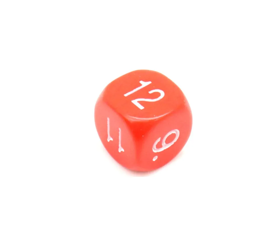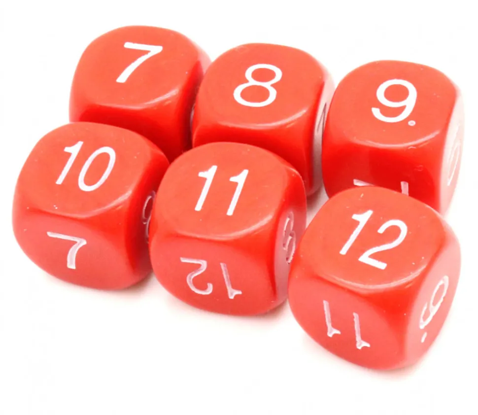 Dé à jouer de 7 à 12 avec les chiffres à la place des points. Dé en plastique rouge et coins arrondis.