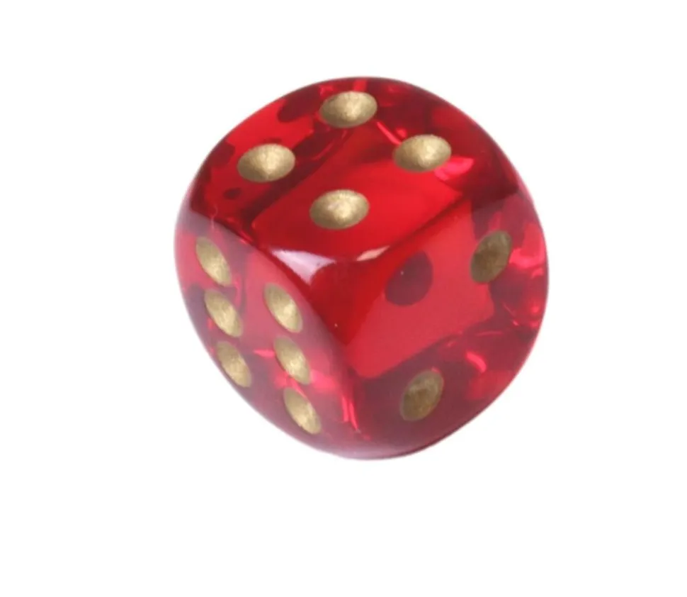 Dé 16 mm Gemini translucide rouge Chessex. Magnifique effet de mélange divers tons rouge orangé et points or.