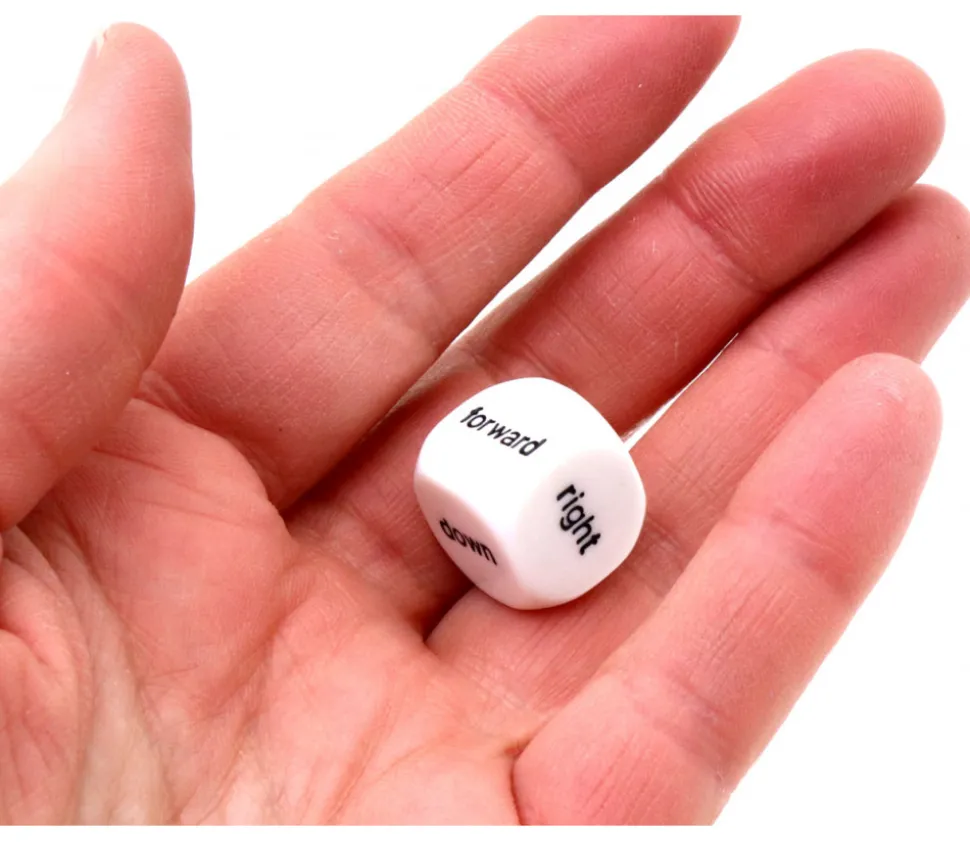 Dé anglais avec les mots de directions gravés sur les faces : up, down, right, left, back, forward.