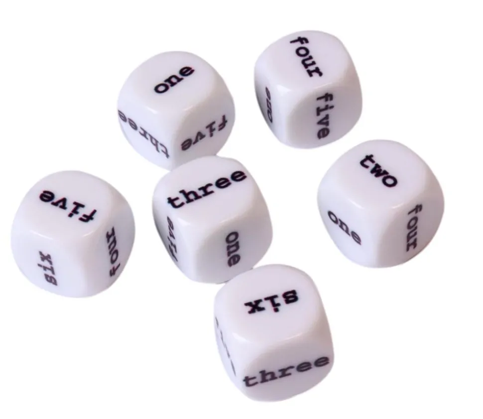 Dé 16 mm blanc avec chiffres en toute lettres écrits en anglais.