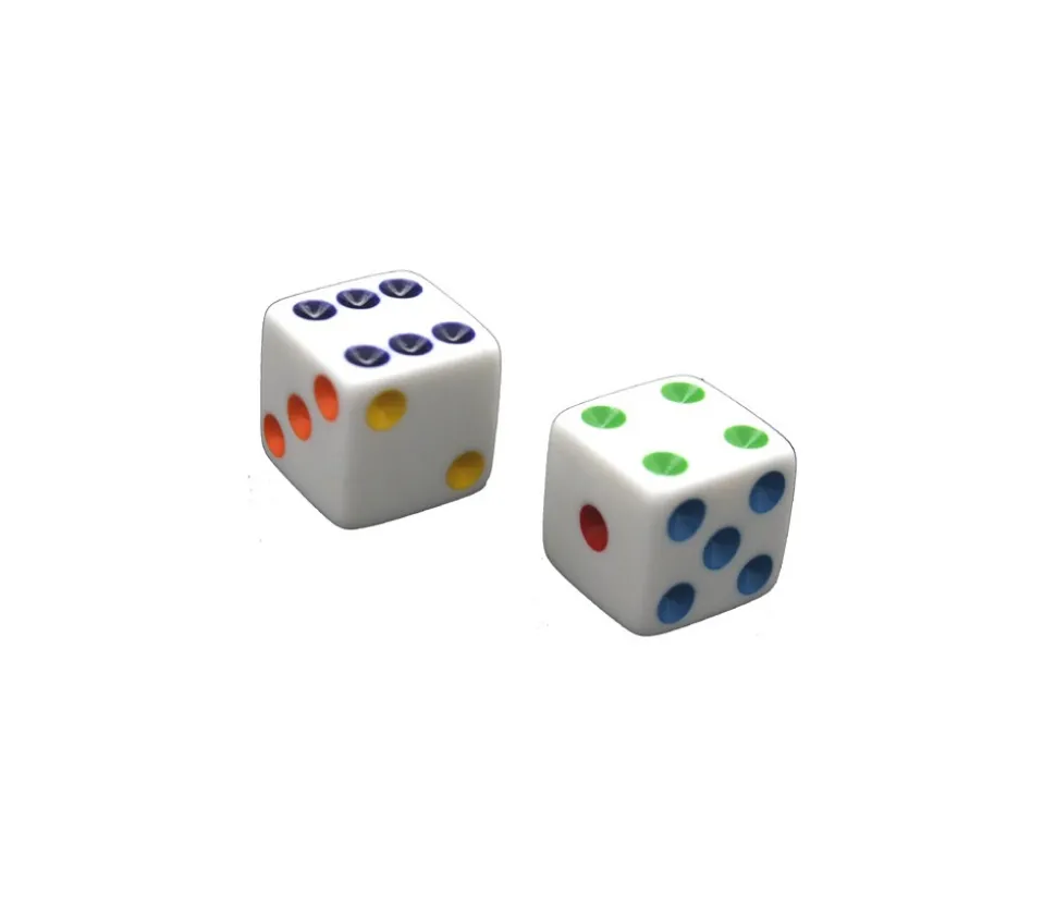 Dé à jouer 16 mm arc-en-ciel avec les points de 1 à 6 en 6 couleurs. Chaque chiffre et associé à une couleur : 1 rouge, 2 jaune, 3 orange, 4 vert, 5 bleu et 6 violet. Dé de jeu blanc aux coins droits avec le gravage des points en couleurs. Achat à l’unité. Tarif moins cher par quantité.