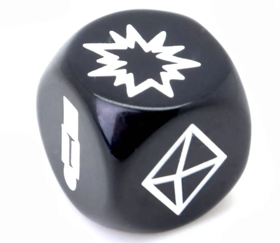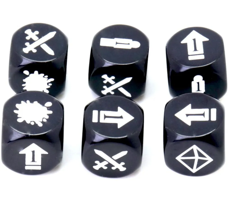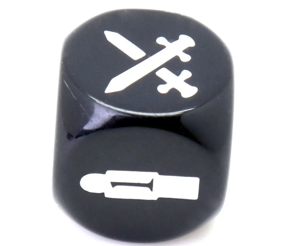 D6 noir avec bords arrondis de taille standard 1.6 cm. Gravage des faces en blanc avec les symboles suivants : épées croisées, explosion, flèche de direction, munition ou blessure joueur, tâche de sang, message.