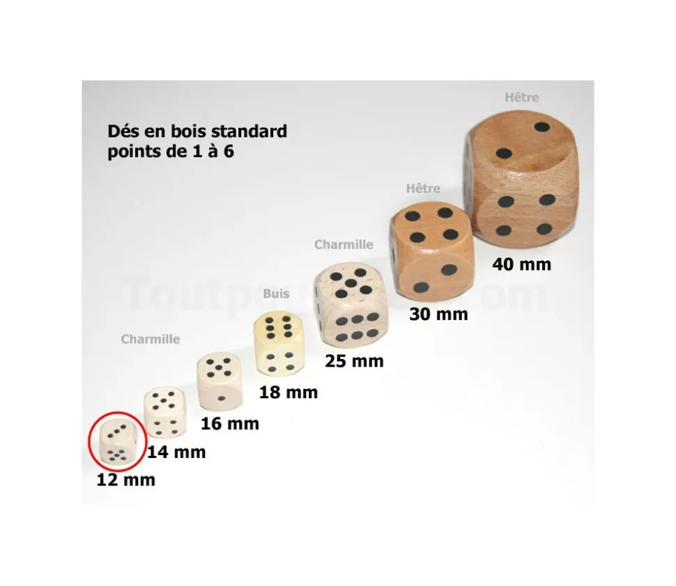 Dés bois 12 mm de 1 à 6 pour jeu de société : Dé classique en bois de 1,2 x 1,2 cm de côté numéroté de 1 à 6 avec des points. Dés de qualité.