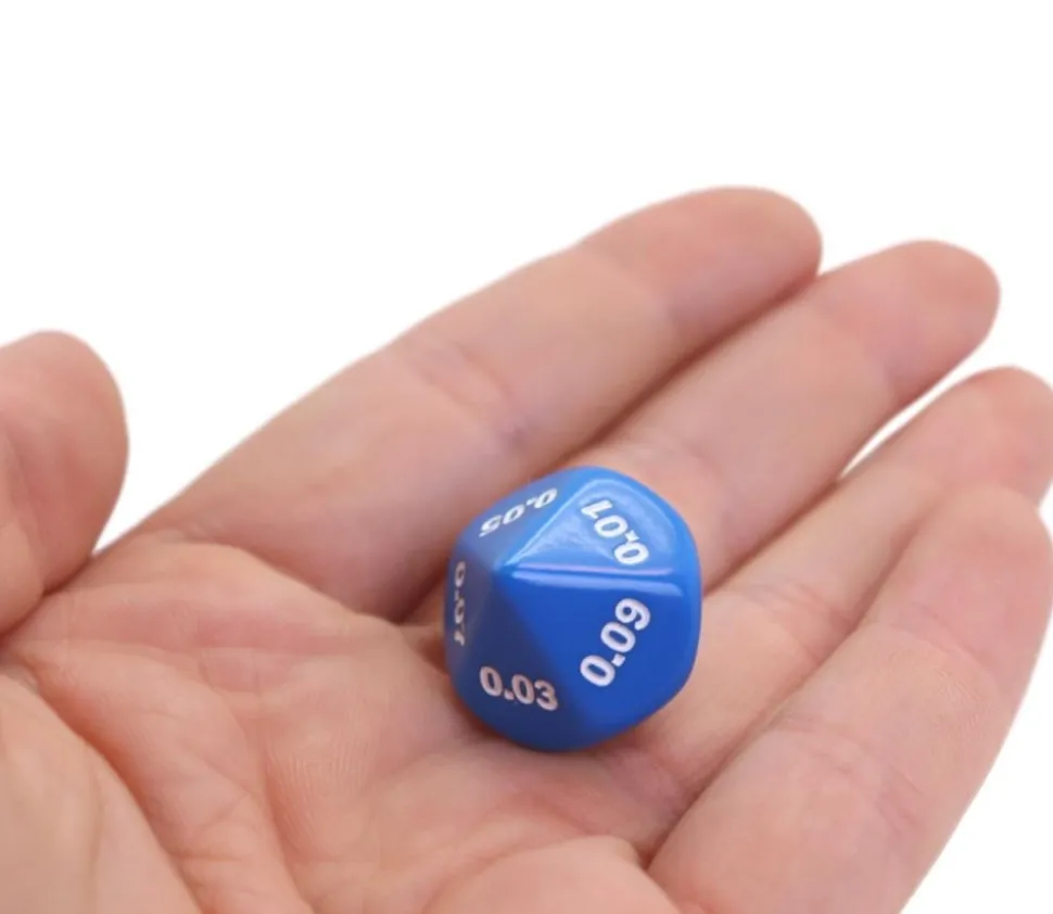 Dé décimal 0.01 0.02 0.03 0.04 0.05 0.06 0.07 0.08 0.09. Dé à jouer blanc 10 faces de 21 mm de diamètre avec des chiffres à décimal. Dés pour jeux mathématiques en classe. Centième de décimal.