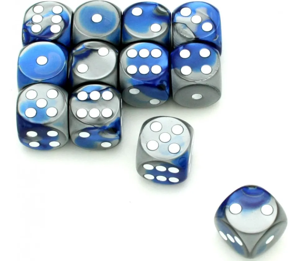 Dé à jouer 16 mm effet peinture métallisé argent et bleu Magnifique dé design. Dé chessex Gemini.
