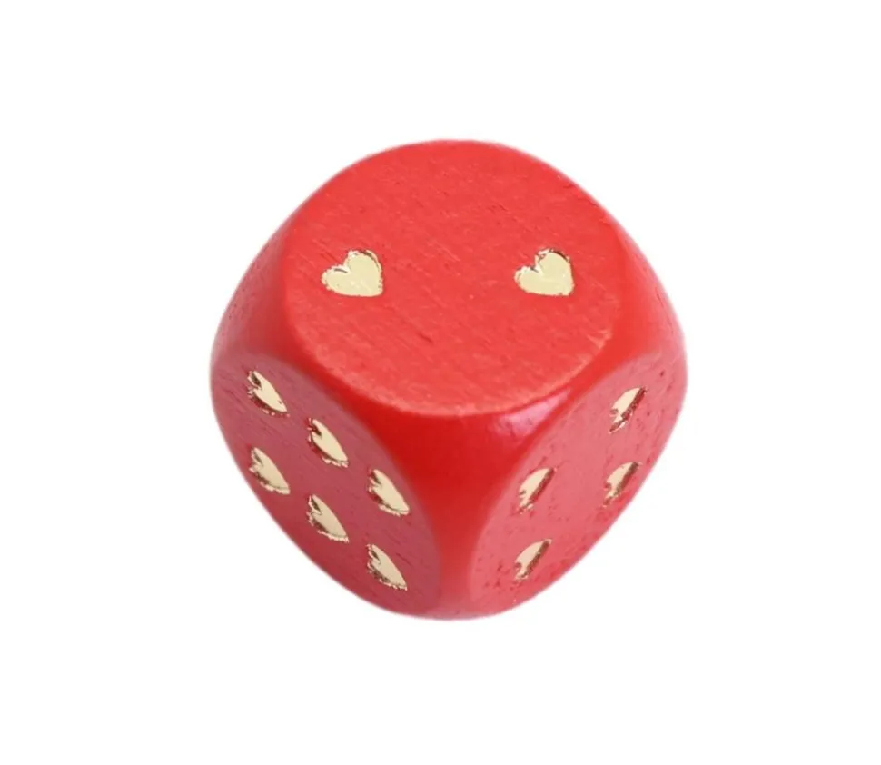 Dé en bois rouge avec gravage de coeurs dorés à la place des points habituels de 1 à 6. Taille standard : 1,6 cm.