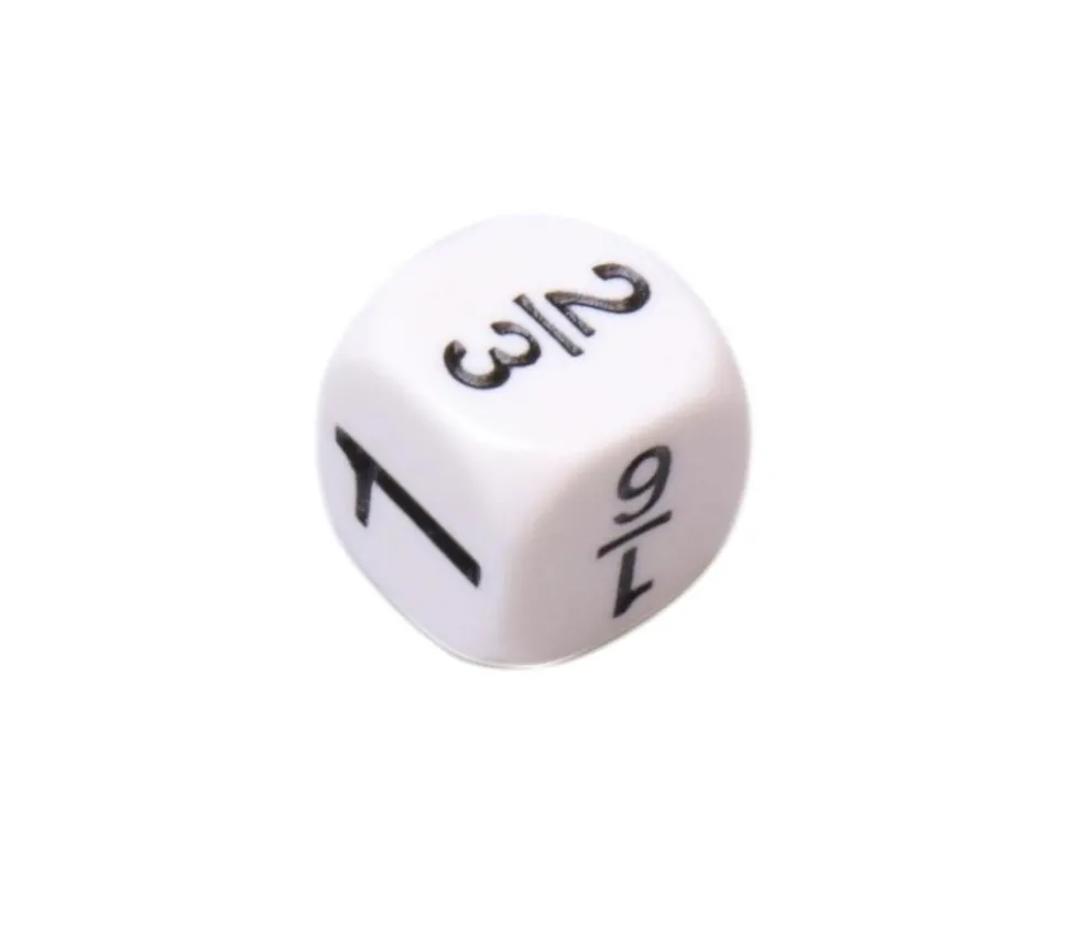 Dé à jouer 16 mm taille standard en plastique blanc avec les faces 1. 1/2. 1/3. 2/3. 1/6 et 5/6