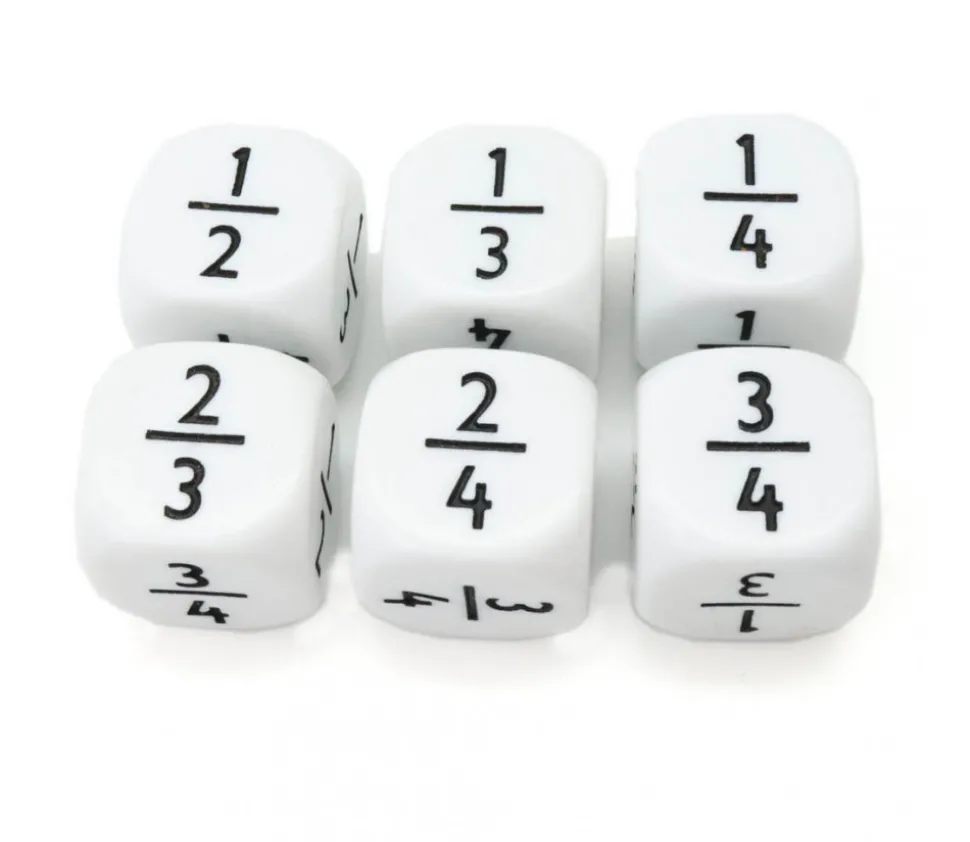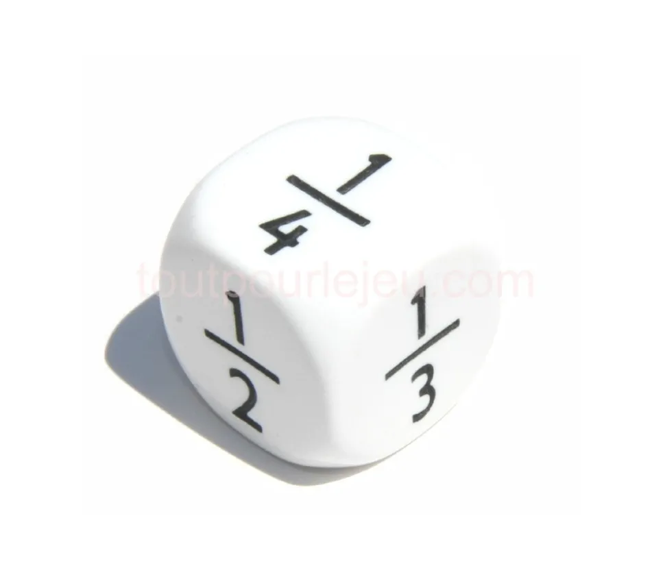 Dé fraction 1/2 2/4 1/3 2/3 1/4 3/4. Grand Dé à jouer blanc de 22 mm avec les fractions sur les faces. Dés pous jeux mathématiques en classe.
