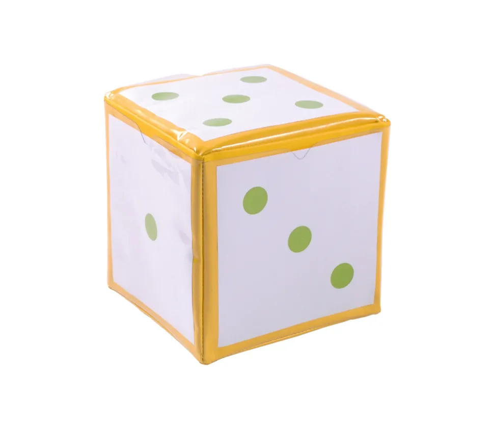 Dé à jouer en mousse recouvert d’une toile colorée lavable jaune de 15,5 x 15,5 cm. Chaque face a des glissières transparentes pour glisser le contenu de votre choix.