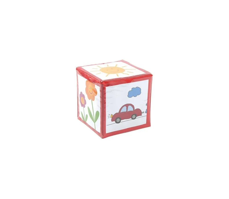 Dé à jouer en mousse recouvert d’une toile colorée rouge lavable de 15,5 x 15,5 cm. Chaque face a des glissières transparentes pour glisser le contenu de votre choix.