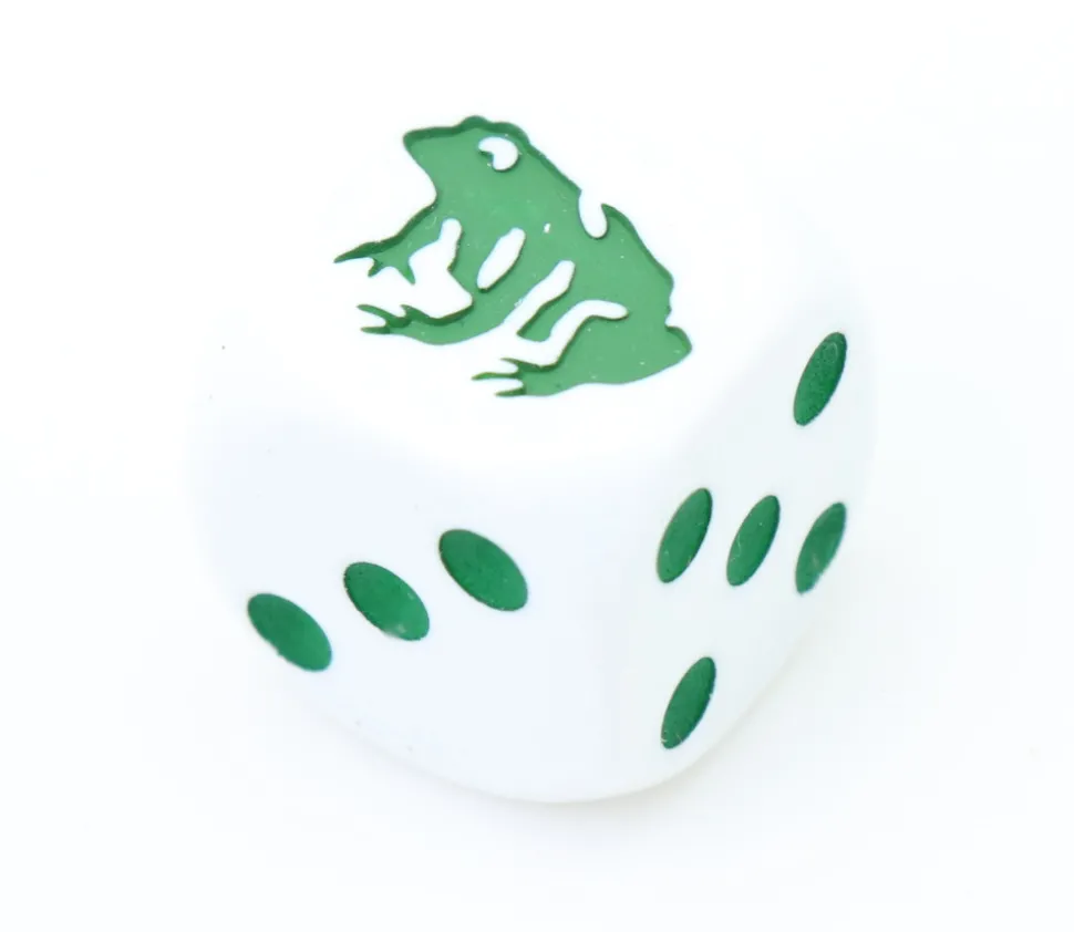Dé en plastique blanc 16 mm avec 1 face spéciale grenouille verte.