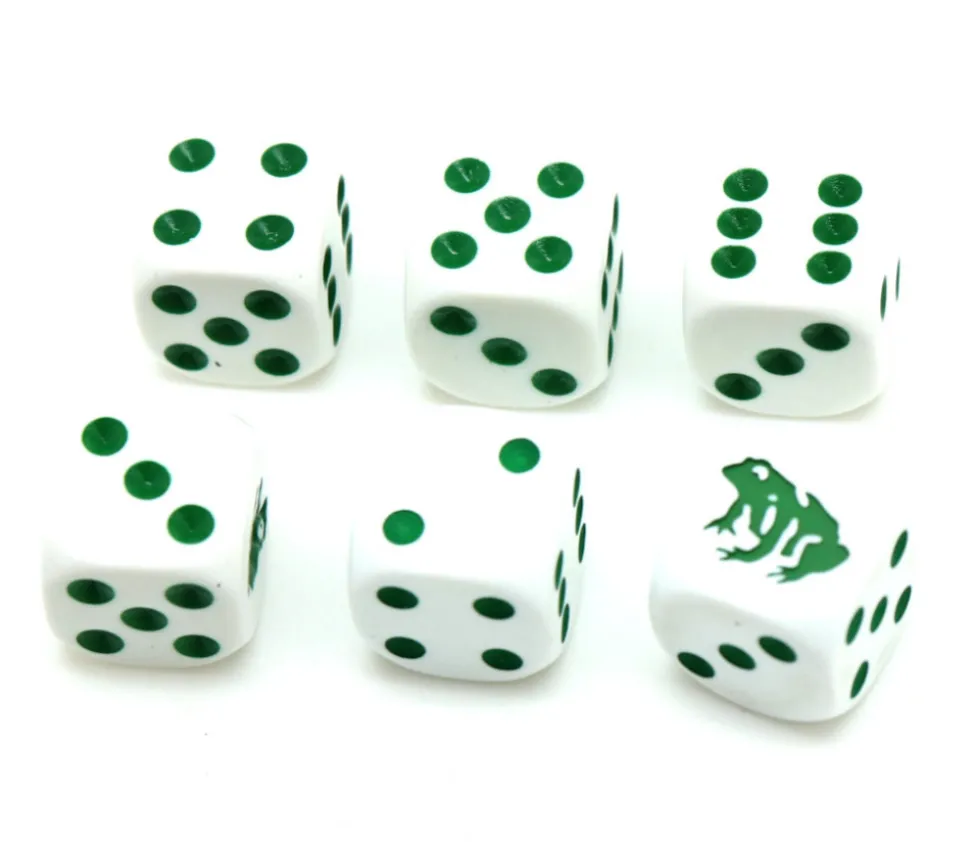 Dé à jouer avec face grenouille verte à la place du 1 et faces 2 3 4 5 6 en points verts.