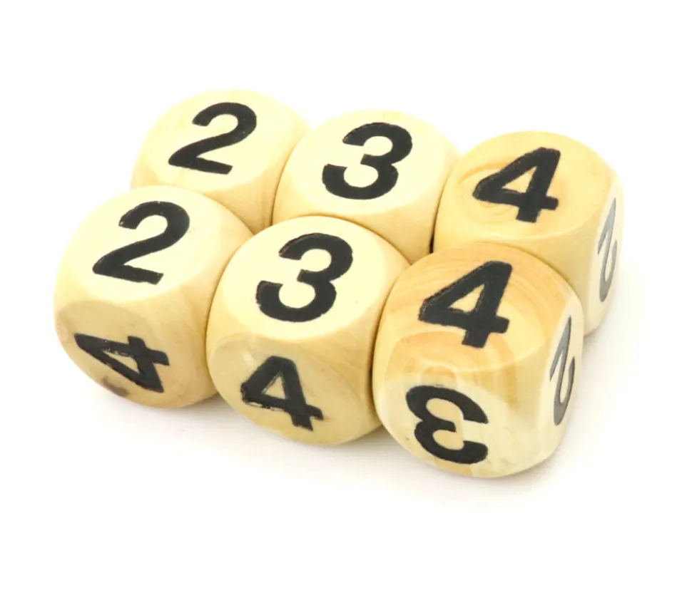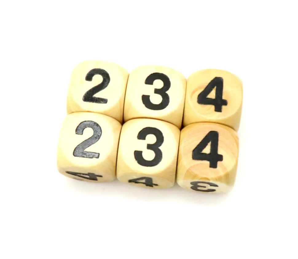 Dé bois aux coins arrondis avec les chiffres 2 2 3 3 4 4 gravés en noir. Dimensions : 1.6 cm de côté.