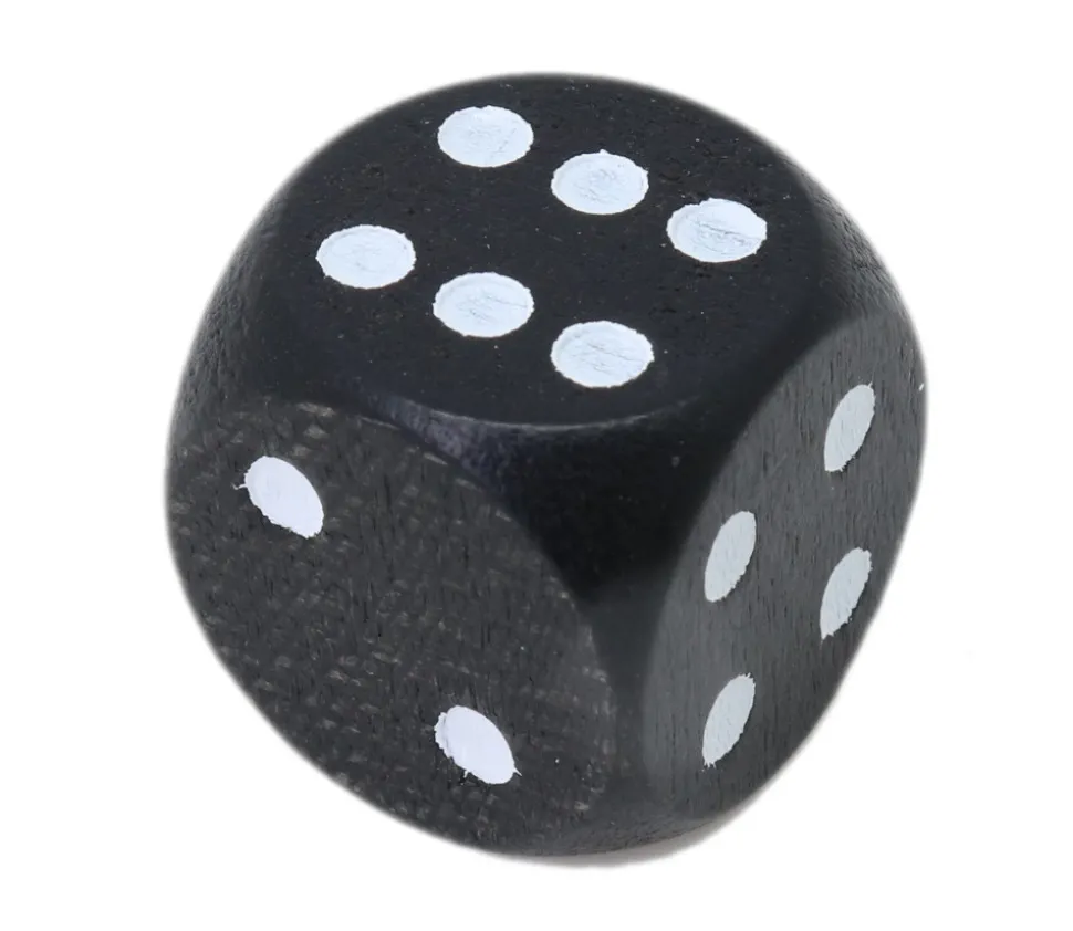 Dé normal avec numérotage à points. Dé en bois couleur noir avec des points blancs.