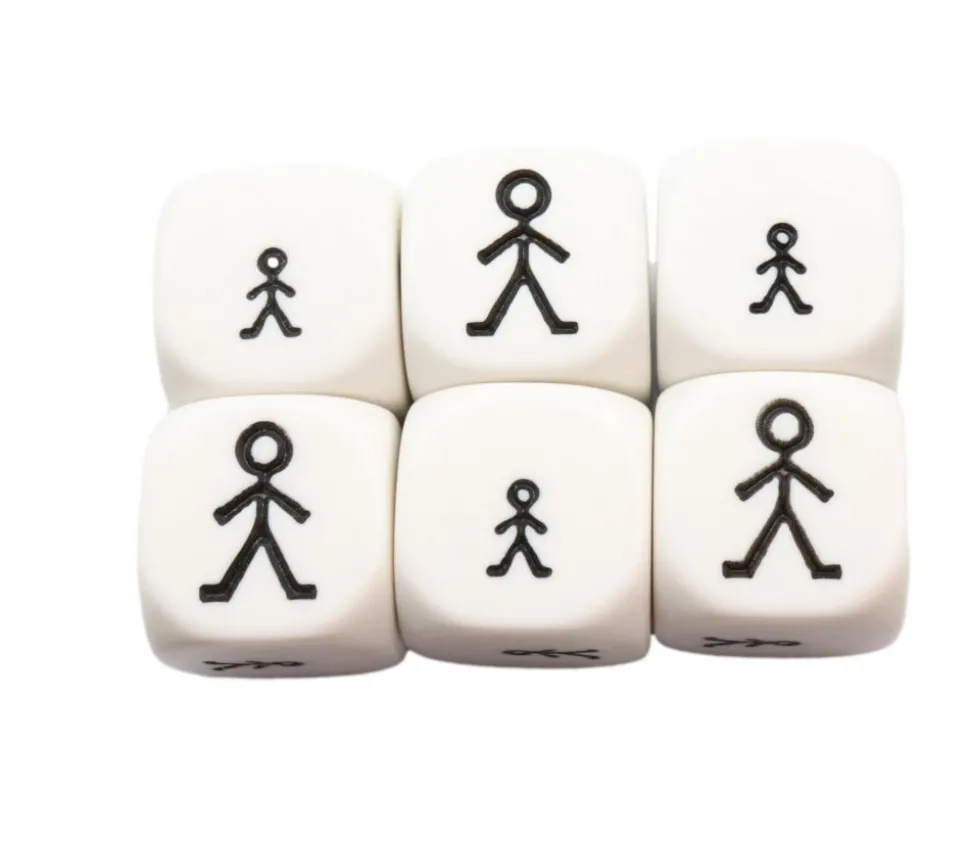 Dé en plastique blanc de 2.2 cm avec gravage des 6 faces : personnage petit, personnage grand, personnage petit, personnage petit, personnage grand, personnage petit, personnage grand.
